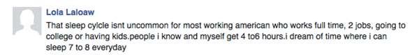 「這個睡眠時間就是很多美國全職,雙兼職員工的睡眠時間啊。很多學生和有孩子的人也只能睡4-6個小時,我做夢都想每天睡7-8個小時。」