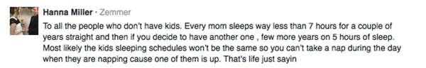 「敬告所有沒有孩子的人啊,當了媽媽以後幾年都不可能睡到七個小時的,如果你又決定再要一個,那麼你又是好幾年只能睡五個小時了哦。因為孩子生物鐘和我們不一樣,所以也不可能在白天打盹哦,生活就是這樣...」