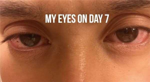 最後他附上了自己每天睡眠5個小時七天以後的眼睛特寫,看起來的確非常的疲倦。