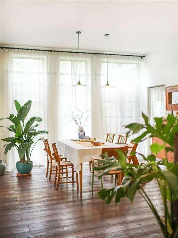 餐廳有3扇細長的玻璃窗,我裝了白色的紗簾,陽光灑進來的時候,光線會變得非常溫柔,吃飯的氣氛也會好起來。