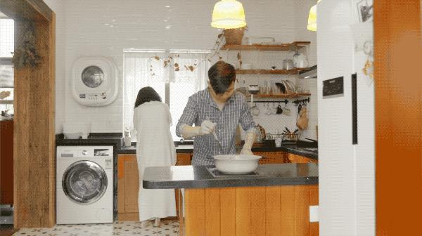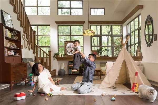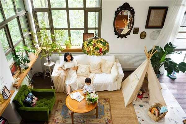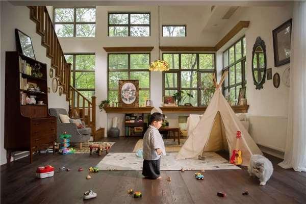 房子有9扇玻璃大窗,屋外大樹環繞,屋內通透明亮,改造後的一樓,是寶寶50平方公尺的超大玩耍空間,二樓露台,是夫妻倆喝下午茶的小花園,廚房裡還有內嵌式電磁爐,兩人可以直接在家裡擺一桌火鍋,住在這裡,真是比隱居山林還舒服!