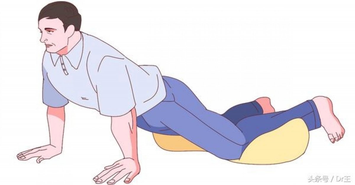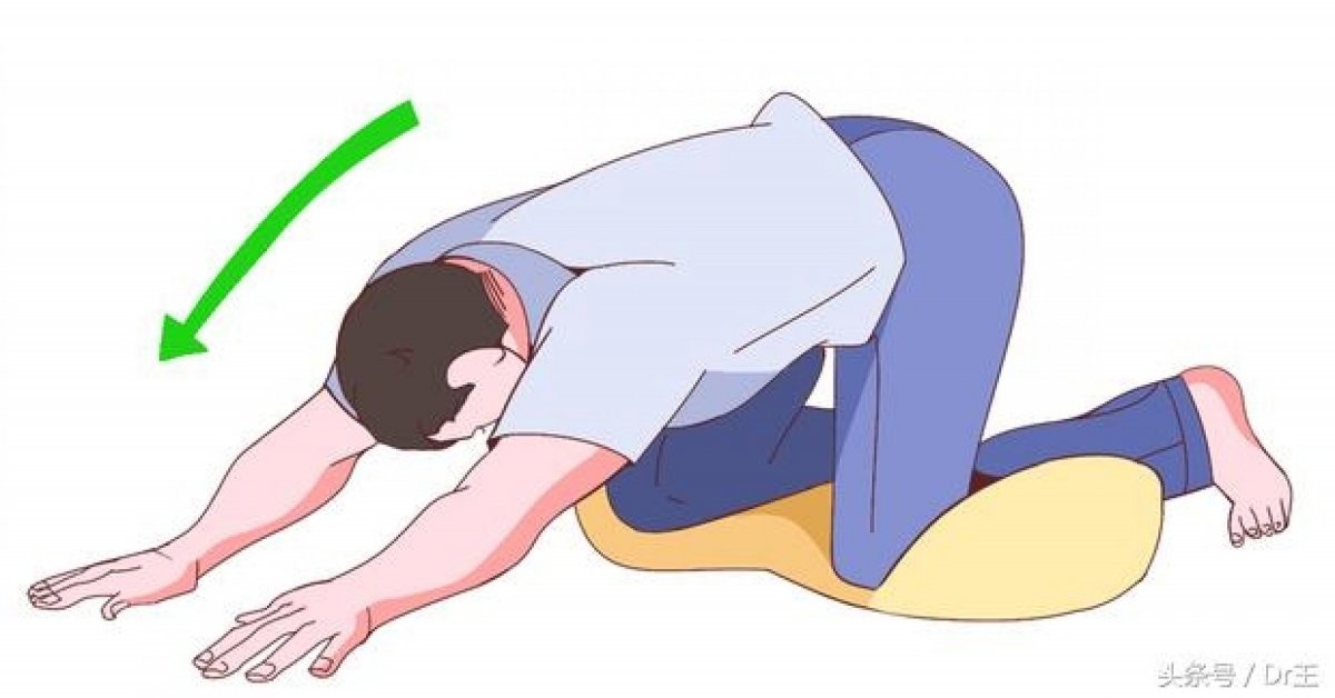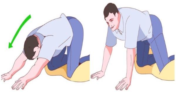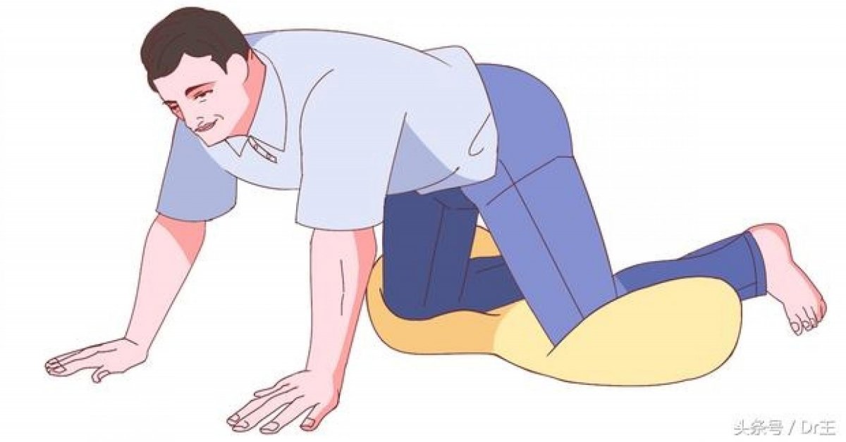 雙膝跪在一個軟墊上,雙手手掌貼地。