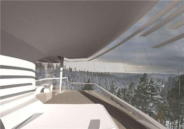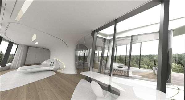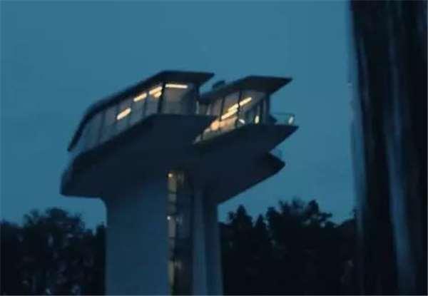 而高高聳立在22公尺的立柱之上的,則是被玻璃圍起來的主人的臥室,高出周遭的環繞的樹木。