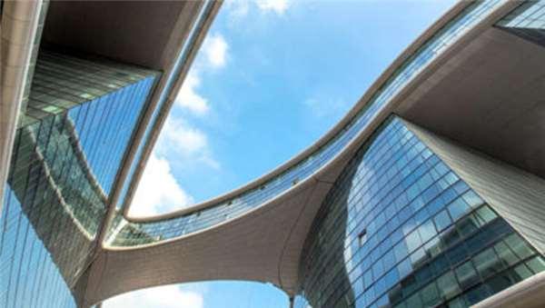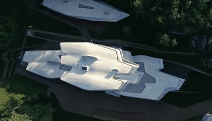 不同於其他的建築,遠遠看去,它外觀顯得錯落有致,呈現流體幾何形。