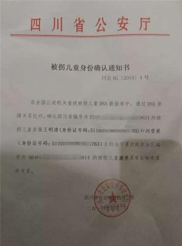 回到家裡,四川省公安廳宣讀了康英的「被拐兒童身份確認通知書」,確認了康英與王明清的親屬關係。