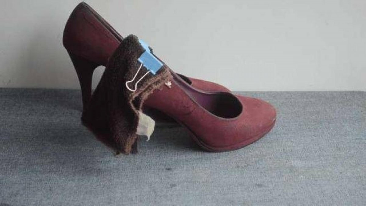 最後將布包裹住鞋子擠腳的地方,並且用燕尾夾夾住,同樣的也放置一晚。