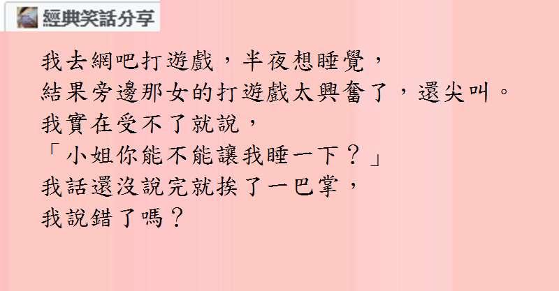 老公回答:「怎沒有?你白天的時候『說我無趣』,晚上的時候『笑我無能』,不也是有說有笑嗎?」