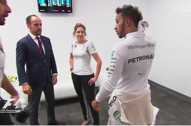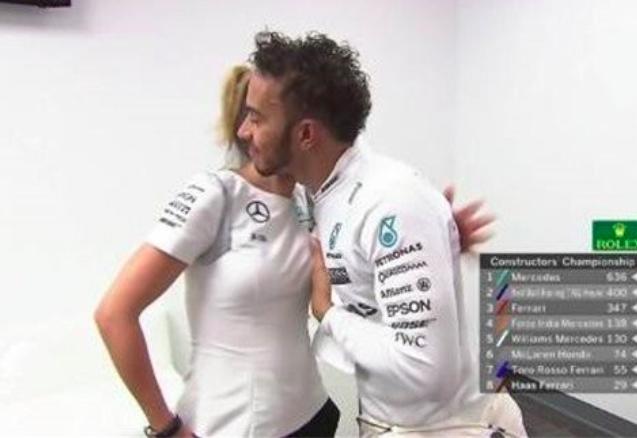 ▼這名車手Hamilton完成了比賽以後回到了休息室,可能因為完賽了相當興奮因此和助理擁抱,大家看到這裡應該是還好,