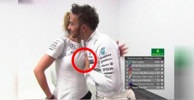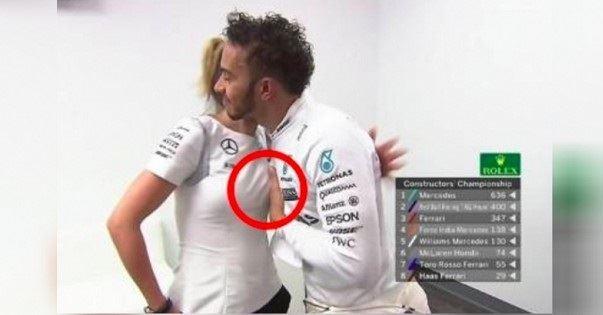 這個主題主要是圍繞在一個英文F1賽車手因為和自己女助理擁抱慶祝,我們可以看到他順勢的把手擋在胸部之間為了避免碰撞,所以巧妙性的這樣遮掩了一下,
