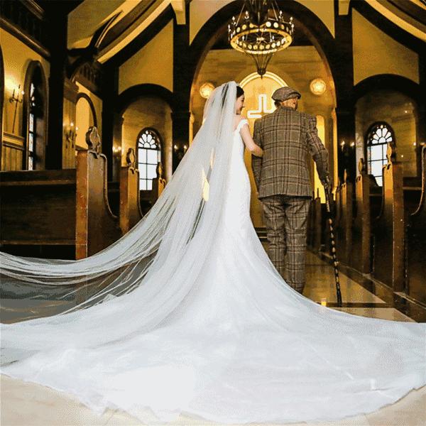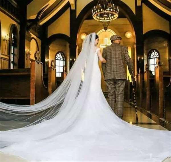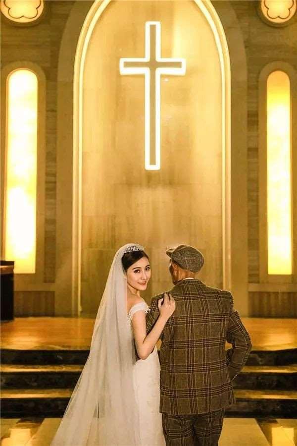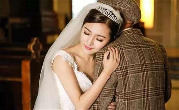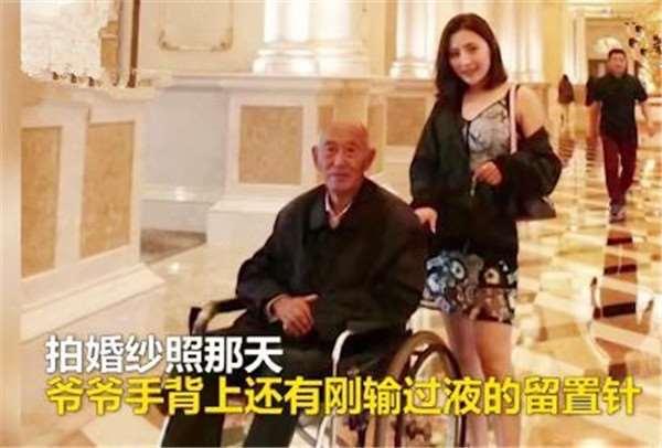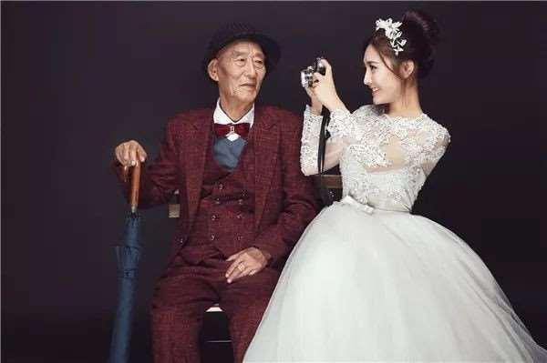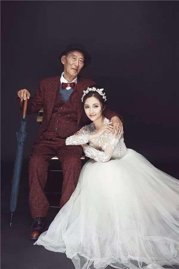 潔白唯美的曳地長裙,飄逸輕柔的透明頭紗,身姿曼妙的新娘,手裡挽著的卻是一位身著西裝、拄著拐杖、背影微微佝僂的老人。