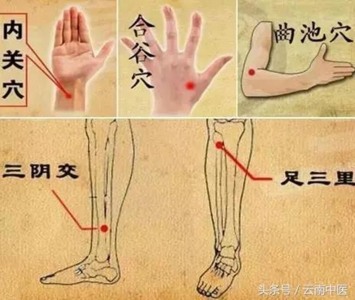 取足三裏、三陰交、曲池、合穀、內關五個穴位,每個穴位用大拇指按揉,每個穴位按摩一分鐘,兩側都要按到。