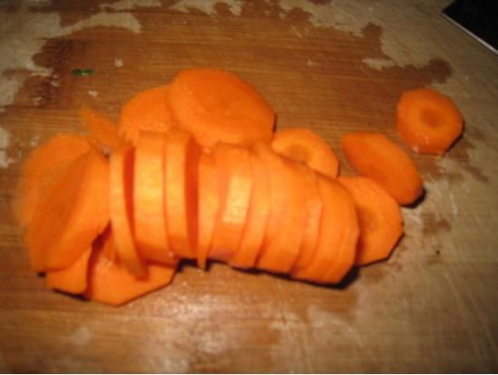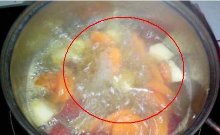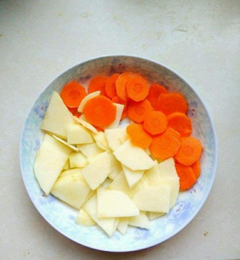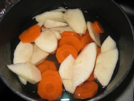 3.鍋中加水,放入蘋果片,胡蘿蔔片