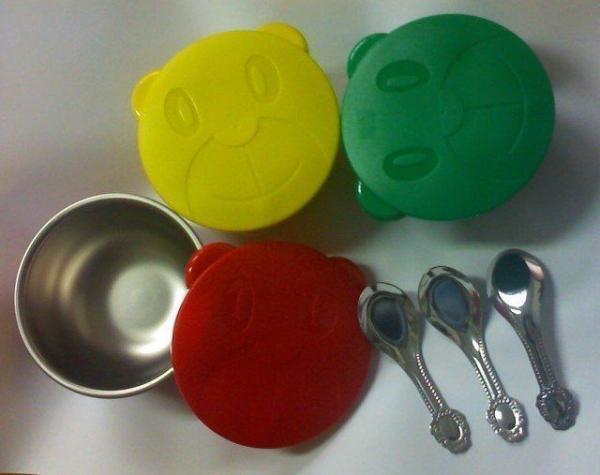 其實這種三色碗,大概在20多年前幼稚園開始採用,除了因應環保,和這種「隔熱塑膠在外、不鏽鋼在內」的設計非常耐操又耐摔,讓小朋友使用安全又方便以外,還有一個很大的功能是「方便老師統一管理」:如果朋友都各自帶家裡各種不同材質、不同顏色的碗,老師在盛飯和指揮小朋友吃飯時會非常混亂,如果帶陶瓷的還可能會有割傷手的風險啊!