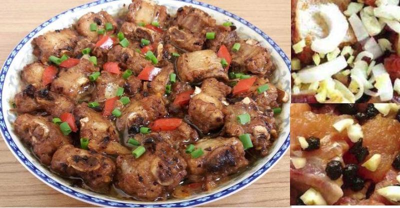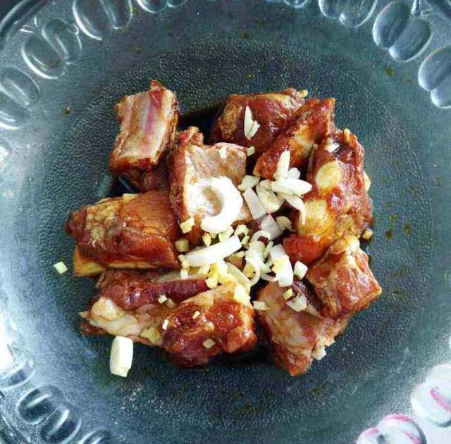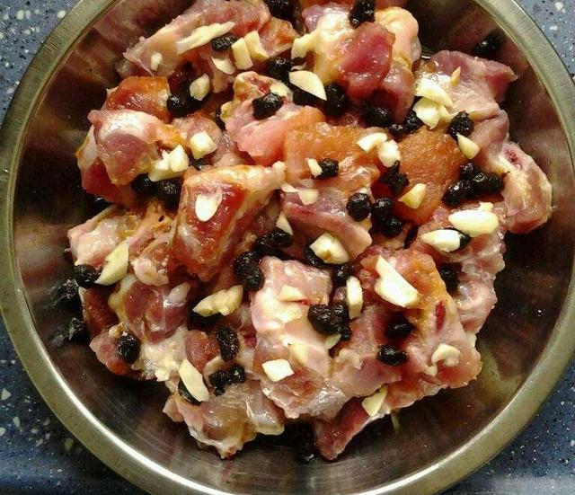 (4)醃製的排骨取出,放上拍扁的豆豉和蒜碎;豆豉不用切碎,拍扁就好了,否則成品效果不好;