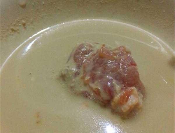 (6)澱粉加適量清水,攪拌成厚濕澱粉,將排骨放進去,裹上一層濕澱粉;