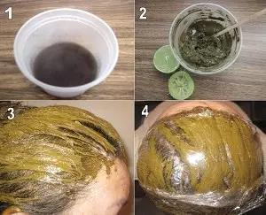 將熱茶水、適量蜂蜜、雞蛋、加入海娜粉,攪拌均勻,還可以放一些橄欖油,攪拌成膏狀。洗一下頭髪,然後將其吹到6成乾。用梳子將天然染髪劑膏塗抹好,疏均勻,用浴帽將頭髪套起來,4-6小時用溫水洗凈。