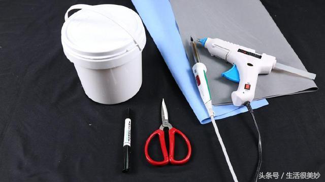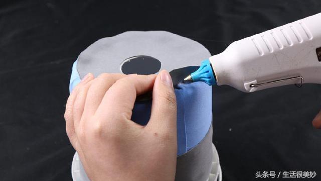 5.用熱熔件把剪好的海綿紙固定在油漆桶上。