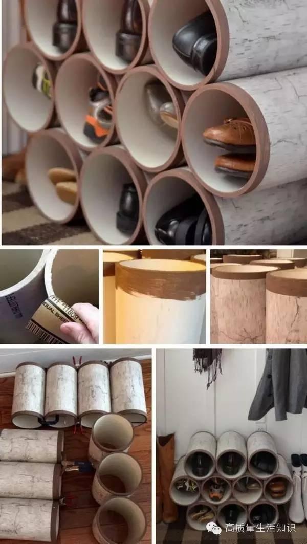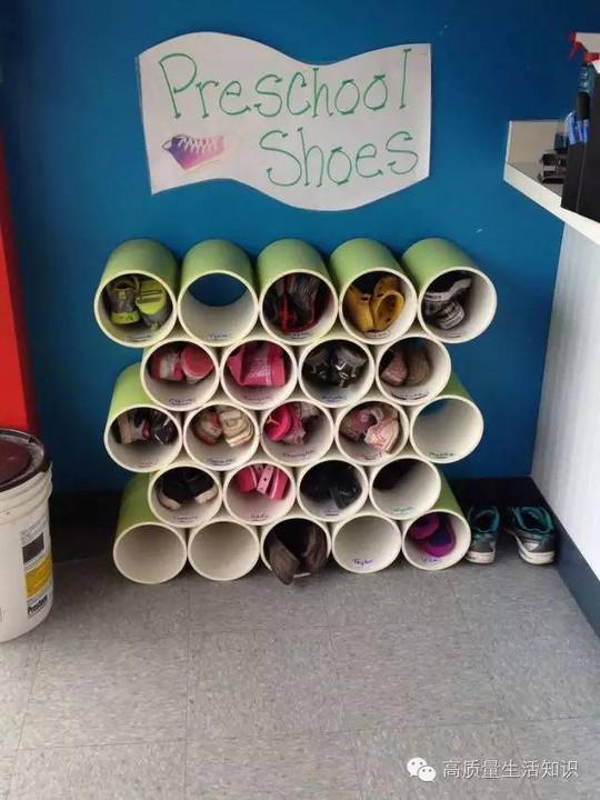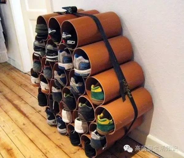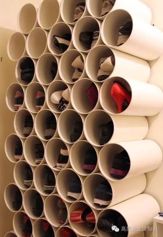 各種款式的春秋鞋子都可以用PVC管收納哦,把管子截成合適長度,用強力粘膠使管子和牆壁粘連,什麼鞋子都適合,是不是很神奇!?
