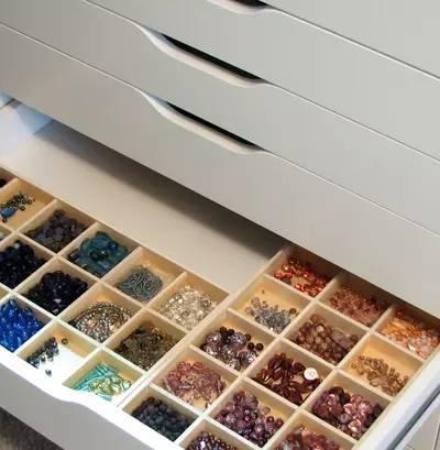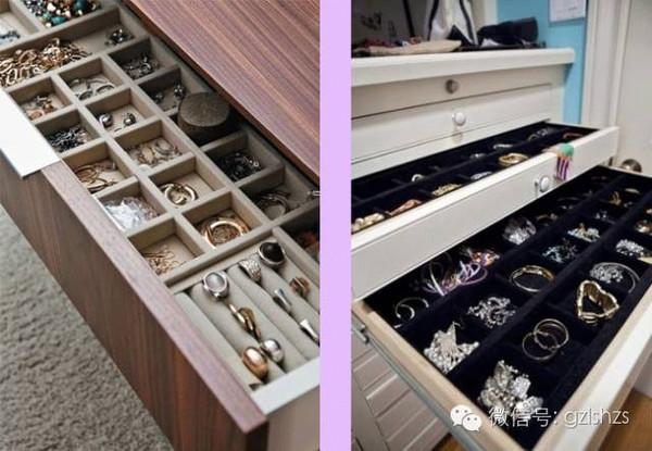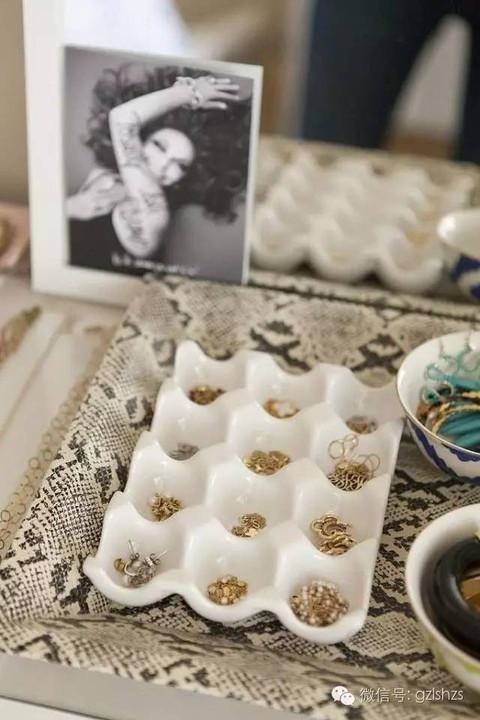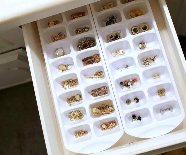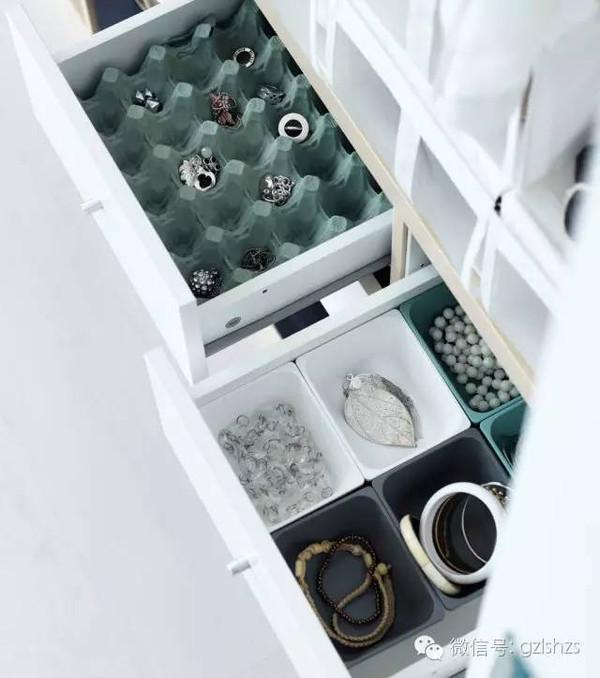 首飾收納最重要的就是獨立存放,避免打結。存放在抽屜中,放一個蛋托就能安放心愛的首飾,太機智~