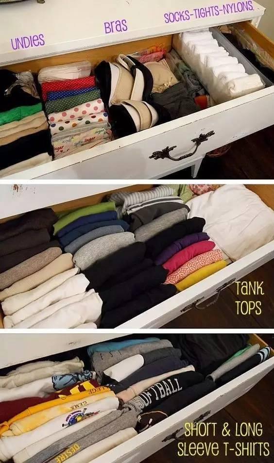 當然,如果你懶得做隔板,直接將衣物捲成條狀排列放置,這樣也比摺疊堆放來得方便~
