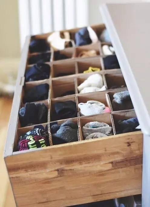 像背心、T恤這類比較薄的衣物也可以用分格抽屜進行整理,用平時包裝用的瓦楞紙做成縱橫相間的隔板更方便放置。