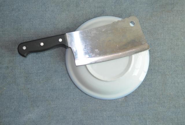 接著將菜刀放在陶瓷碗底部上磨就可以了。最後在磨的時候,讓菜刀與陶瓷碗成39度的夾角。