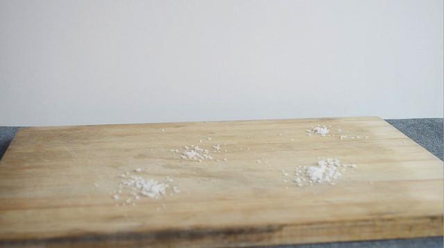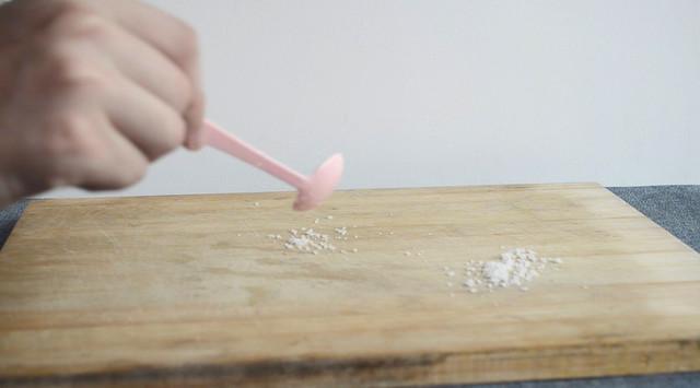 首先往菜板上倒入一些食鹽,中間部分多倒一些,因為這裡是切菜經常使用到的地方,細菌雜又多。