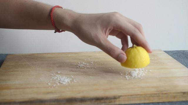 然後準備半個檸檬(或者白醋),擠一些檸檬汁到食鹽上,再將檸檬壓著食鹽不停的去擦拭菜板每個角落。