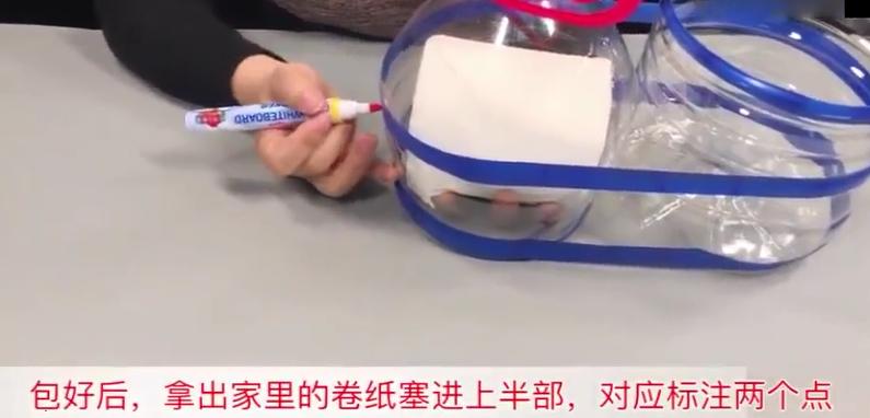 6.包好之後,拿出家裡的捲紙塞進上半部分,對應兩個孔的位置,標註兩個點,然後用剪刀在這兩個點處,戳兩個洞!