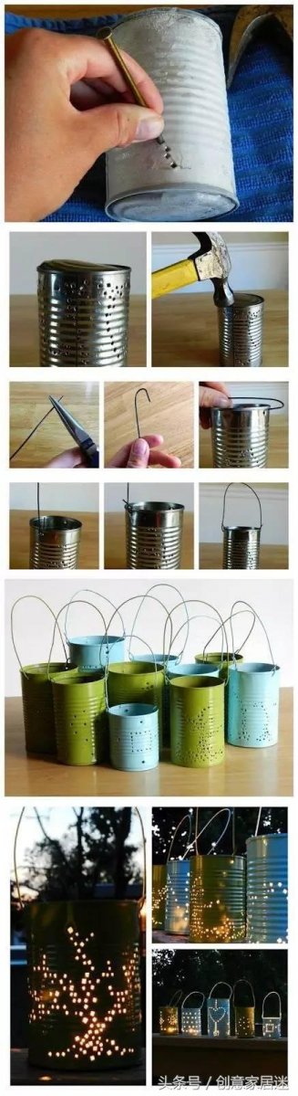 第一步:用鑽孔器或釘子+鎚子在奶粉罐上打孔,孔的樣式和形狀自定;