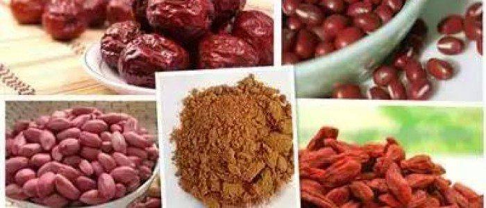 紅棗七牧,紅豆50克,紅花生50克,紅糖適量,枸杞5克,五味共同熬湯,連湯共食用。