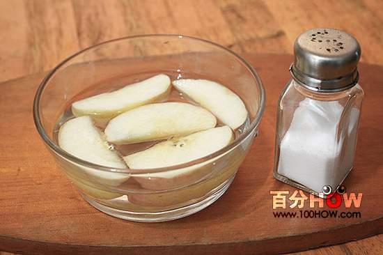 6,將切好的蘋果放在鹽水裡浸泡一會。這樣就可以保持相當長時間不變黑,適合切成小塊做沙拉的時候用。