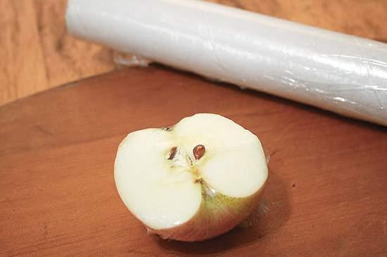 5,在切口上緊緊覆蓋一層保鮮膜。對於那些蘋果常吃一半的同學有用了。盡量避免切口上的保鮮膜有皺紋什麼的,這樣隔絕空氣,杜絕私下反應。