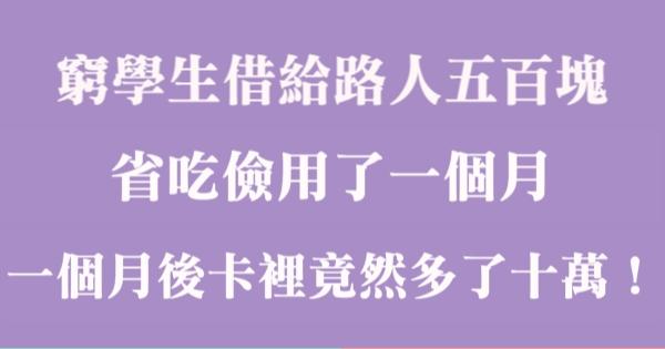 哈摟哈摟各位讀者~~我是有錢人這麼想小編Pineapple!今天要來說說關於「窮學生借給路人五百塊,省吃儉用了一個月,一個月後卡裡竟然多了十萬!」,不知道大家有沒有興趣呢!一起來看看是怎麼樣的事吧!