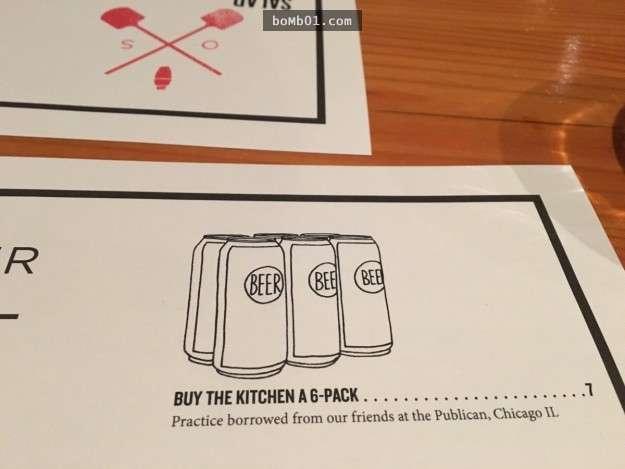 ▼菜單上有獨特的選項,客人可以為廚房工作人員買一打啤酒。