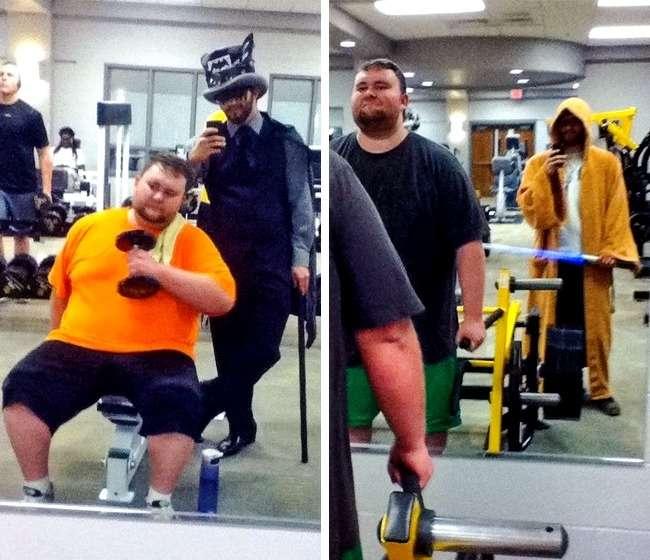▼朋友覺得自己太胖,在健身房運動很尷尬,他就穿得超奇怪過去陪他。