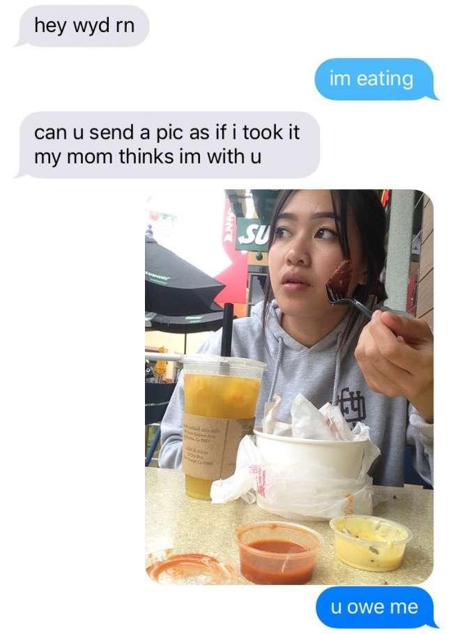 ▼「你在幹嘛?」「吃東西啊。」「能給我傳一張看起來就像我拍的照片嗎?讓我媽覺得咱們在一起。」