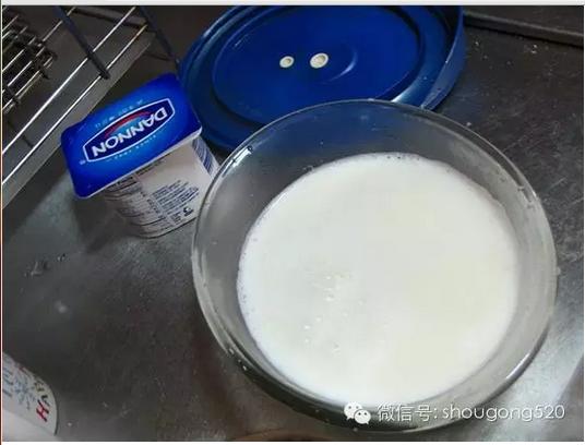 第一步把所有會接觸到的器具用開水或酒精消毒。接下來把全脂牛奶煮開到大規模冒泡,期間持續用勺子攪拌,防止牛奶在鍋底燒焦。為了安全起見即使牛奶包裝上寫著消毒過的牛奶也要再煮開一遍!接下來等牛奶冷卻下來一點,這時候挖出兩勺酸奶放置在室溫裡。