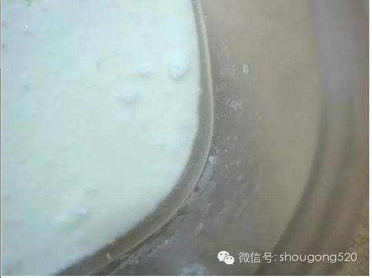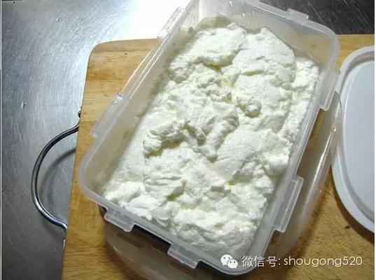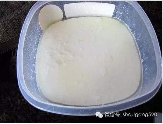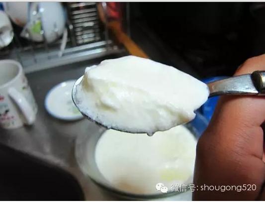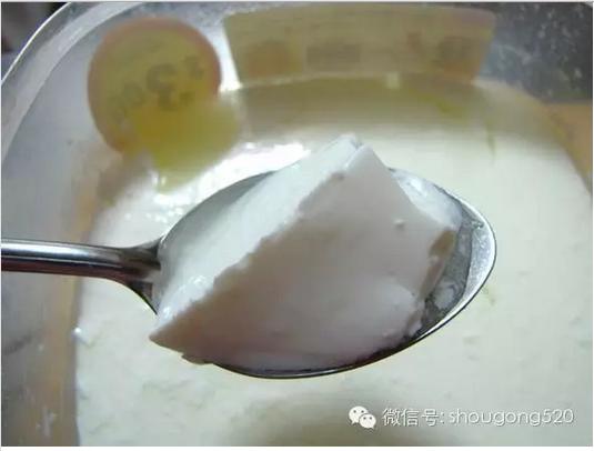 挖起一勺,像豆腐一樣!酸奶完成了。 接下來可以選擇將酸奶直接裝入封閉的容器裡塞冰箱裡,讓乳酸菌緩慢成長速度。或者可以進一步用紗布分離乳清與酸奶。