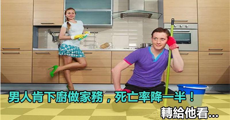 一幫科學家找了近3000個年齡差不多、體質差不多、生活習慣差不多的男男女女,圍觀了9年後發現——男人做家務勞動,尤其是吸塵、擦地板、拖地、擦洗窗戶、洗車、搬動傢俱、搬煤氣罐等重型家務,死亡率竟然降低了一半以上!