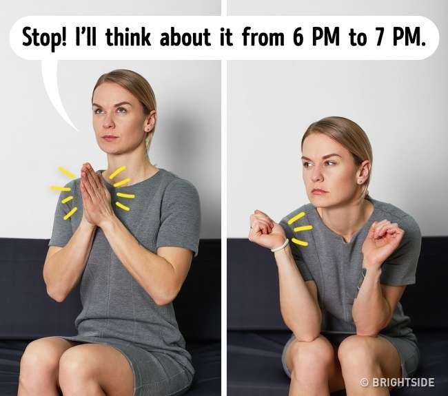 心理學家Martin Seligman推薦一種簡單而流行的方法來幫助你理清思緒,拍?你的手,大叫「停止!我以後再考慮!」也可以在手腕上戴上一個帶子,當你開始思考那些讓你感覺有壓力的事情時,你可以把它折斷或掐住自己,用這樣的方法來停止思維的循環,並把問題推遲一段時間,然後,試?把你的注意力轉移到別的事情上去。