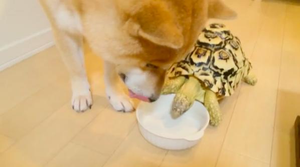 牠的烏龜好朋友,雖然生活在陸地,但水分的補充還是很重要,這天,阿柴看到烏龜要喝水了,但是那個水盆怎麼...好像有點高!就在這時候!柴柴走了過去...