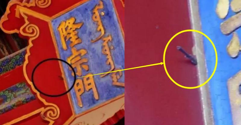 而隆宗門上的箭鏃就是那個時候留下的,嘉慶皇帝要求不要拔,留在那裡以此示警。就這樣,匾額和門柱上的兩個箭鏃一直保留了近200多年。而當時王朝腐敗到連個大門也看不住的程度,如果東華門、西華門的官兵居然連幾十名起義軍都無法阻擊在紫禁城之外,可見那時候清朝已經開始走下坡路了。