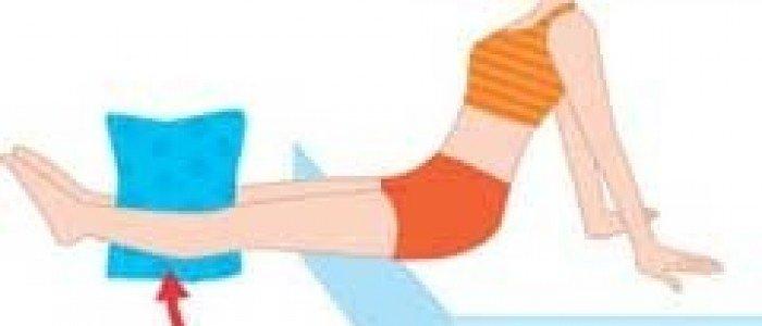 2.彎曲雙膝、擠壓。此一動作要點爲用力擠壓枕頭,做15次爲一組動作,共做1~3組。