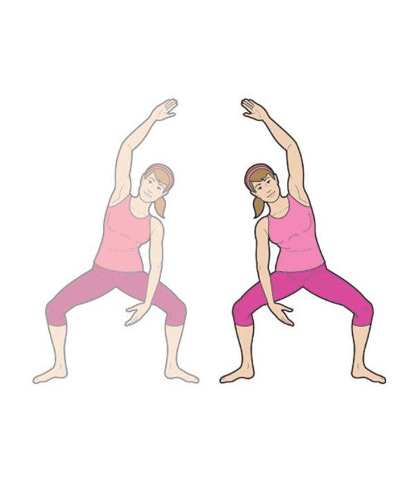 1、雙腿張開,膝蓋微彎,寬度略寬於於肩膀,(保持膝蓋不超過腳尖),上身挺直,右臂向左側伸展。
