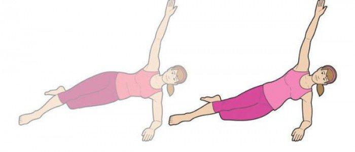1、身體側躺,用左手肘支撐,(手肘低於肩膀),伸展右腿抬高身體,將左腿彎曲貼地在右腿後方。
