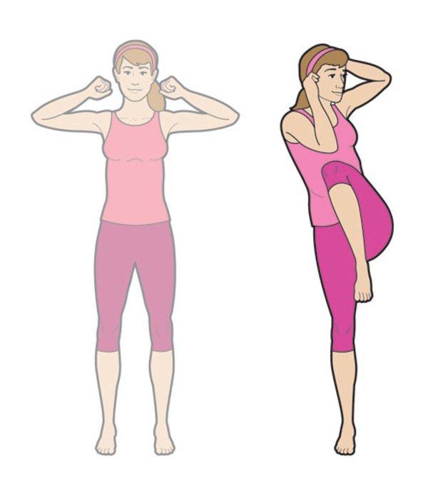1、站立姿勢,手肘彎曲,右腳抬起往左手肘靠近