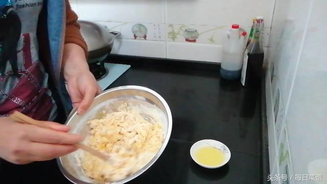 再打入雞蛋和麵,先用筷子把麵粉攪拌成絮狀。