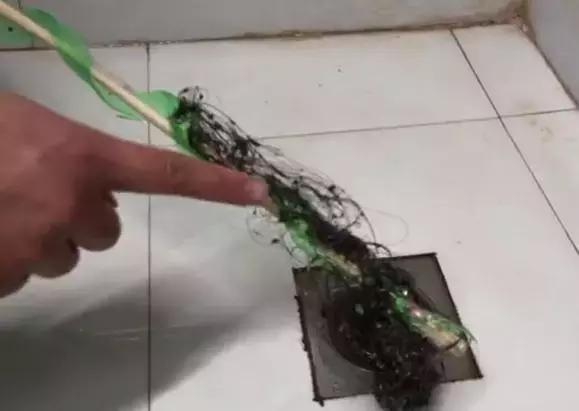 7、把棍子往上一提,下水道的頭髮就被塑膠瓶倒刺勾住了,一大坨頭髮就清理出來了。