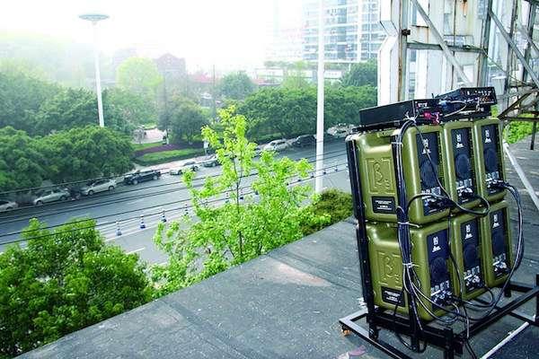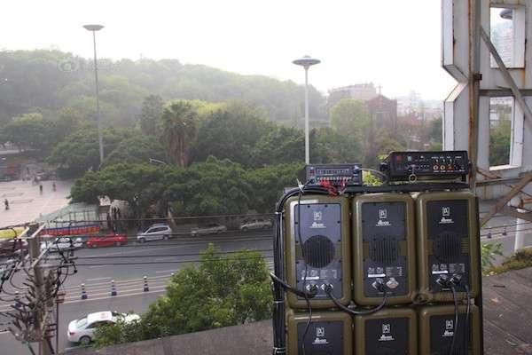 ▼這組音波炮就被放在4樓平台上,大媽一跳廣場舞就立刻發炮,播出:「請遵守中華人民共和國環境噪聲汙染防治法,立即停止違法行為!」強大的威力徹底蓋住了廣場舞的音樂聲。